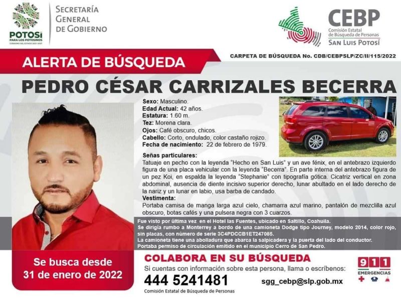 El Gobierno de San Luis Potosí emitió una ficha de búsqueda por el reporte de desaparición de Pedro Carrizales “El Mijis".