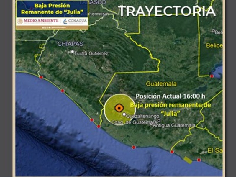 El Servicio Meteorológico Nacional y la Conagua informaron que Julia se debilitó este lunes 10 de octubre a baja presión remanente al suroeste de Guatemala.