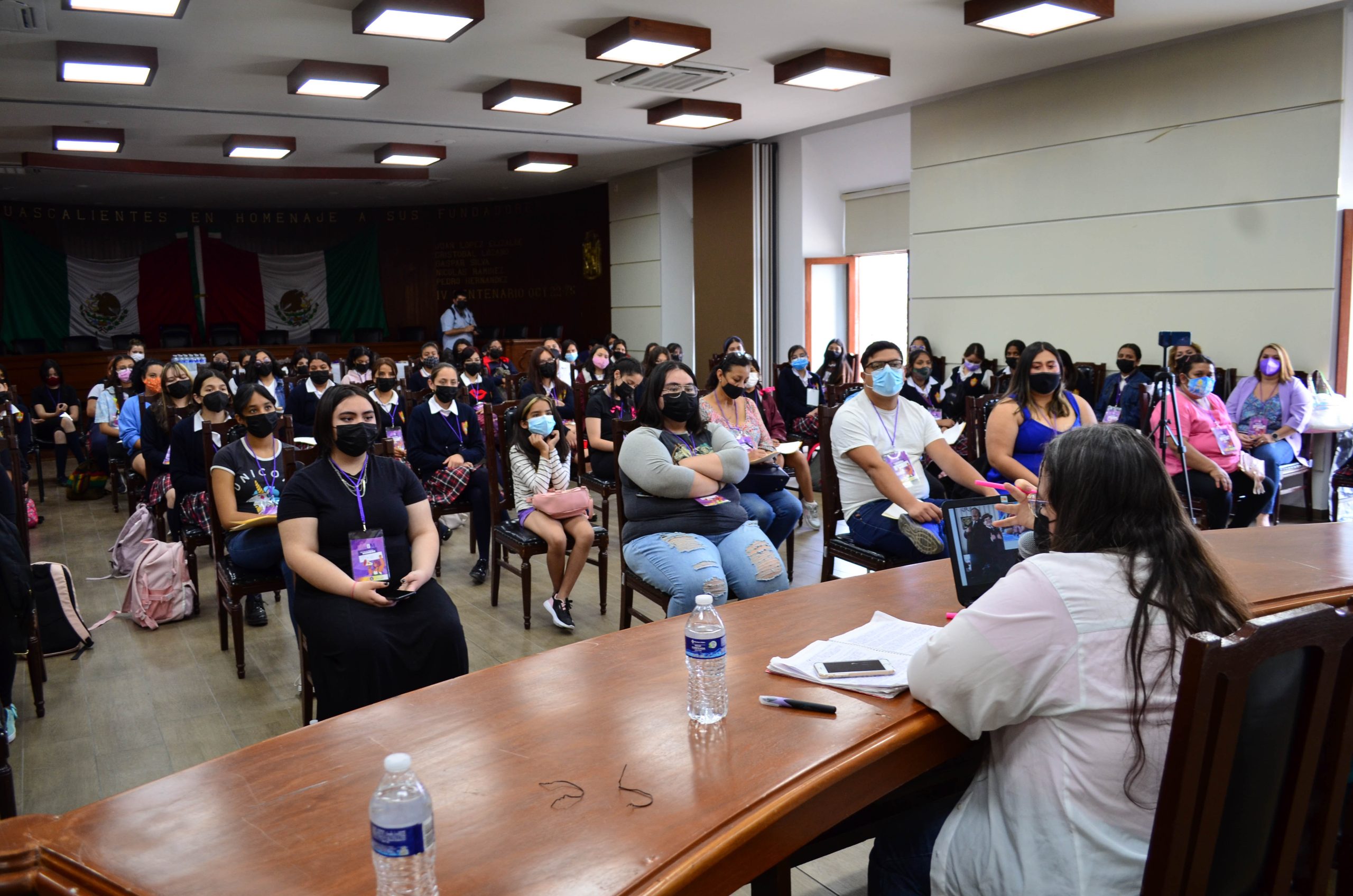 Paola Cerna Gutiérrez, fue la encargada de encabezar la plática que se impartió a estudiantes de la Escuela Normal de Aguascalientes, en la cual destacó los temas de discriminación y segregación que la sociedad genera hacia las personas con sobrepeso.