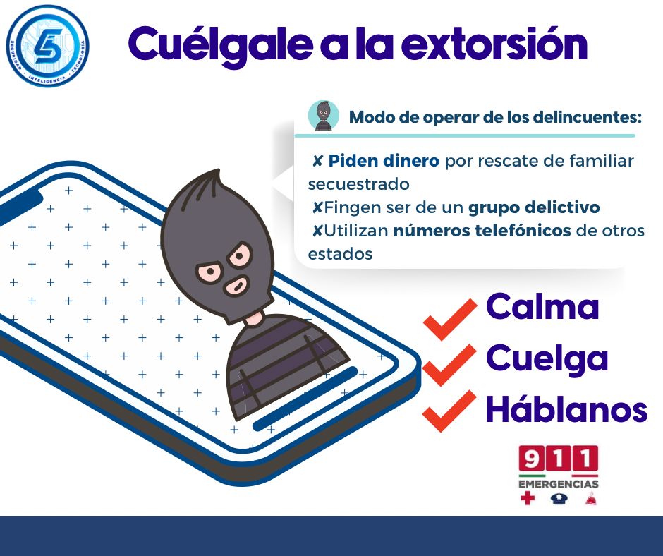 El titular de la SSPE, Manuel Alonso García, invitó a la población a que, en caso de recibir llamadas telefónicas de algún número desconocido, en las que se le solicite dinero a cambio de evitar cualquier daño o situación que ponga en riesgo la integridad de alguien, se comunique al 911 o 089.