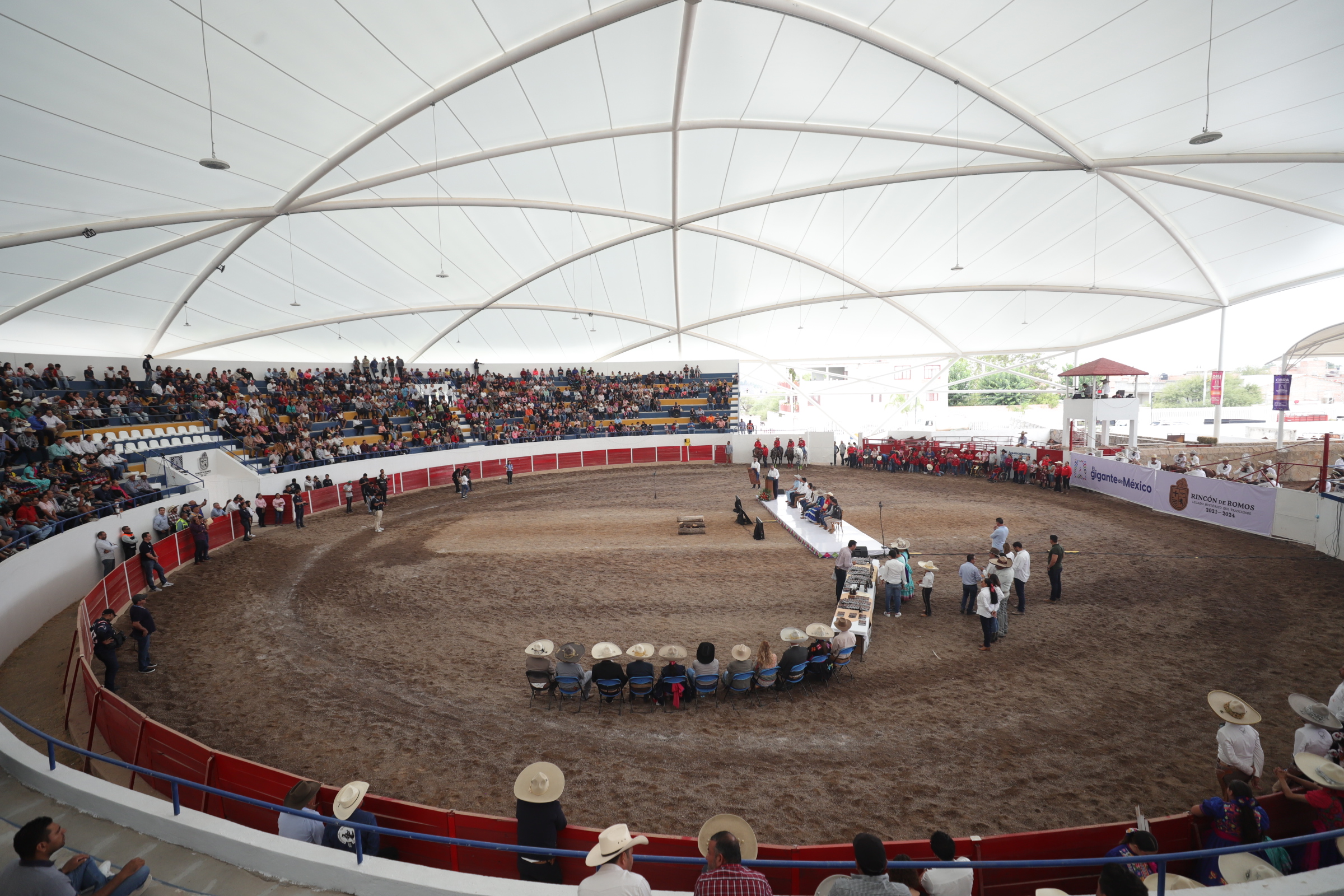 Al respecto, la secretaria de Obras Públicas del Estado, Carolina López López, detalló que la rehabilitación del Lienzo Charro de Rincón de Romos contempló la construcción de la manga y la instalación de dos velarias que en su conjunto suman mil 500 metros cuadrados y 20 toneladas de estructura metálica para su colocación.