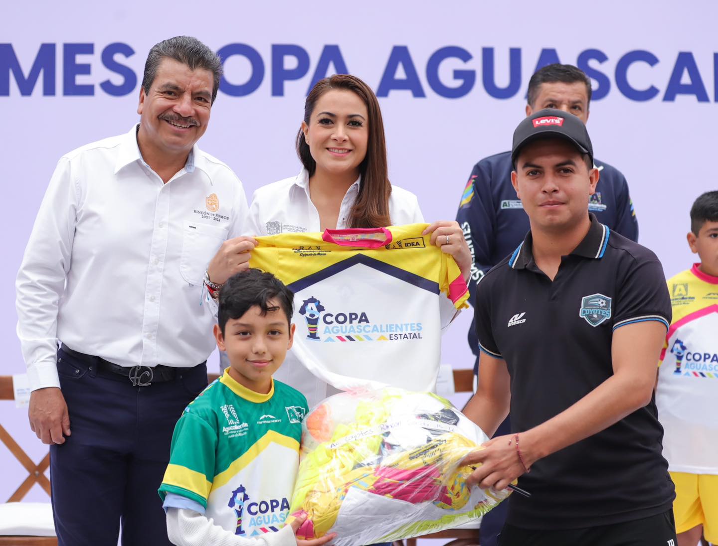 En el evento que se realizó en la Unidad Deportiva de Rincón de Romos, Tere Jiménez entregó uniformes a 109 equipos de futbol soccer que representarán a los municipios de Asientos, Cosío, San José de Gracia, Tepezalá y Rincón de Romos, en la Copa Aguascalientes.