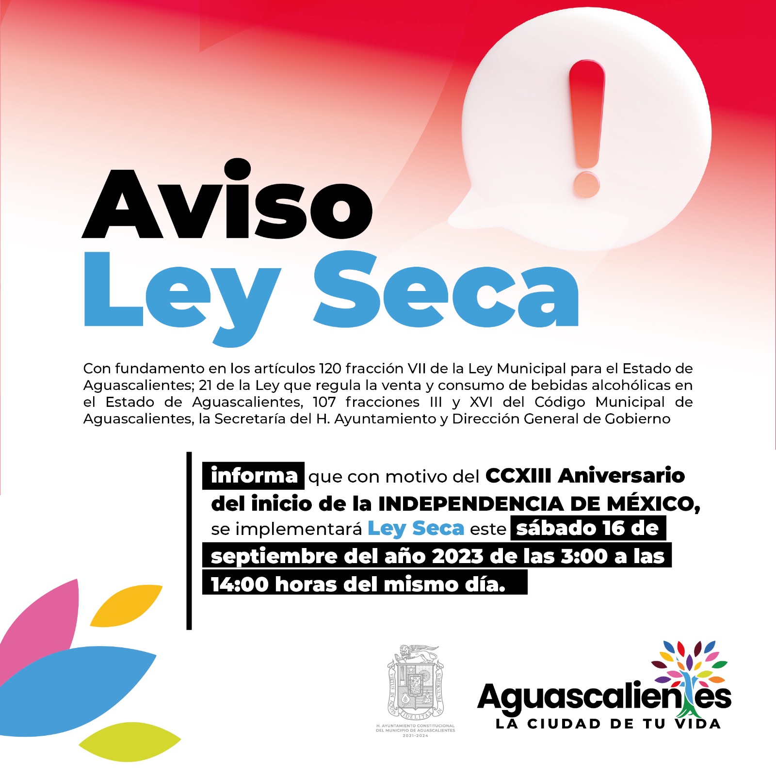 La Secretaría del H. Ayuntamiento y Dirección General de Gobierno, informa que, con motivo del CCXIII Aniversario del inicio de la Independencia de México, se implementará Ley Seca, el sábado 16 de septiembre del año 2023 de las 03:00 horas a las 14:00 horas del mismo día.