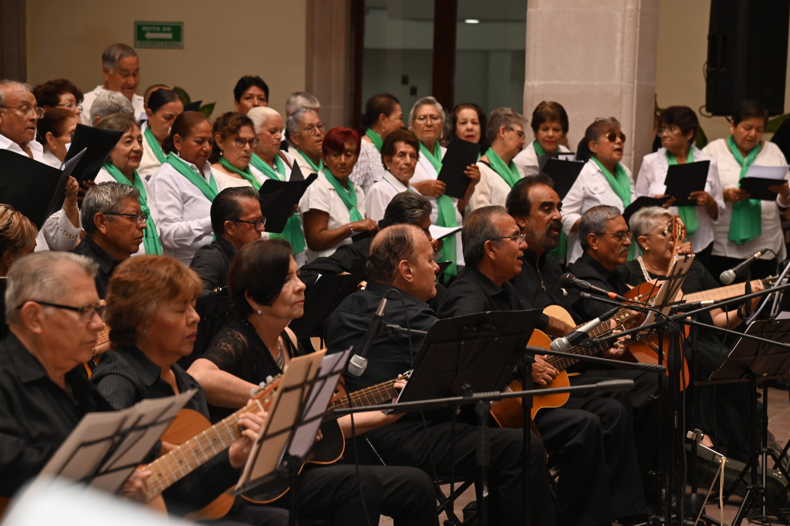 Lucio Ochoa informó que la rondalla “Voces y Guitarras del Ayer” está conformada por más de 100 abuelitas y abuelitos de los dos Centros de Integración de Adulto Mayor y de diferentes clubes de adultos mayores del DIF Municipal. Resaltó que la mayoría empezaron desde cero, pero gracias a la constancia deleitaron a los presentes con canciones como “Payasito”, “O sole mío” “Perfume de gardenias”, “De colores”, “Ella” y “No tengo dinero” entre otras.