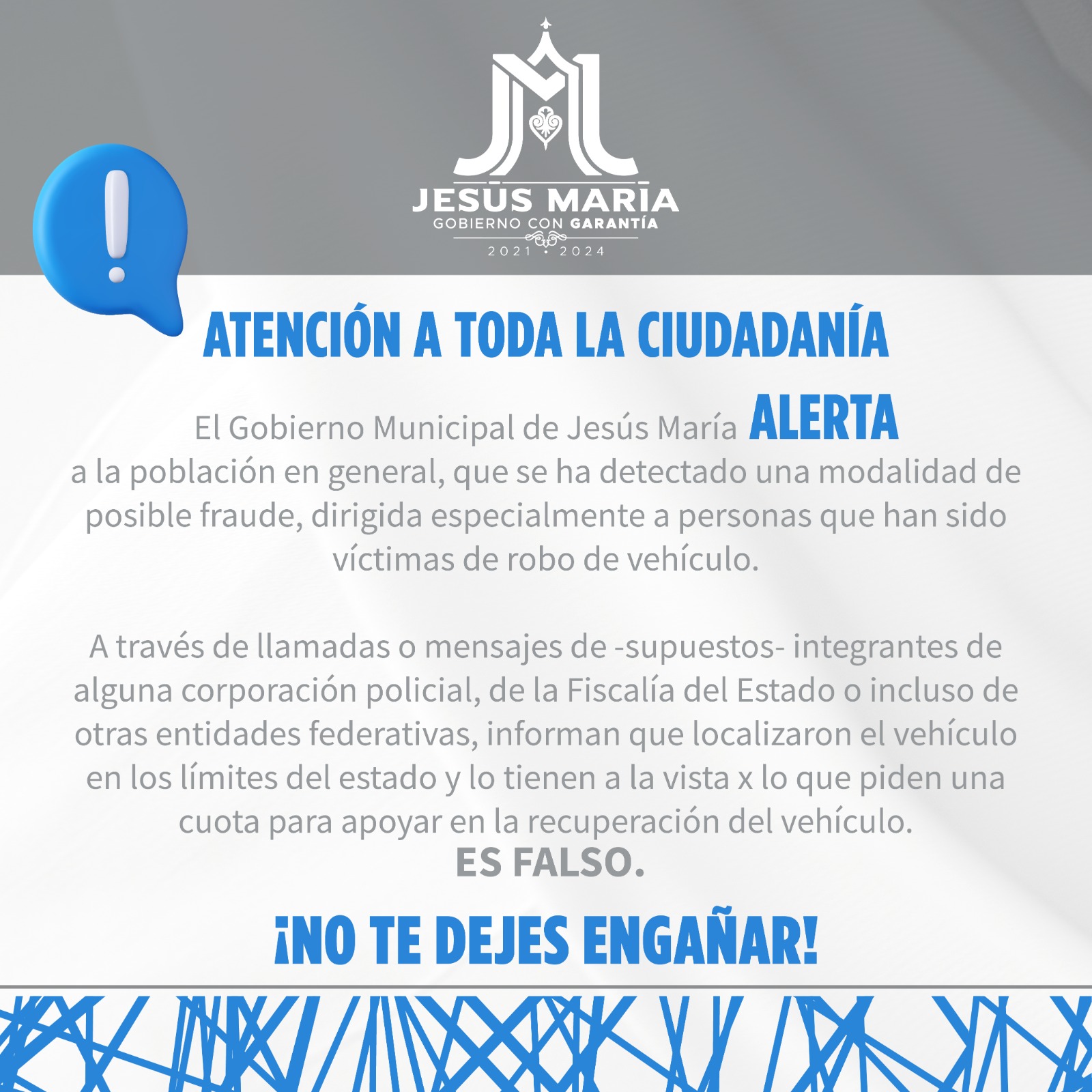 El Gobierno Municipal de Jesús María a través de la Secretaría de Seguridad Pública y Vialidad, informa que se ha detectado una modalidad de fraude por lo que se exhorta a la población a no dejarse engañar, ni efectuar ningún depósito a personas desconocidas.