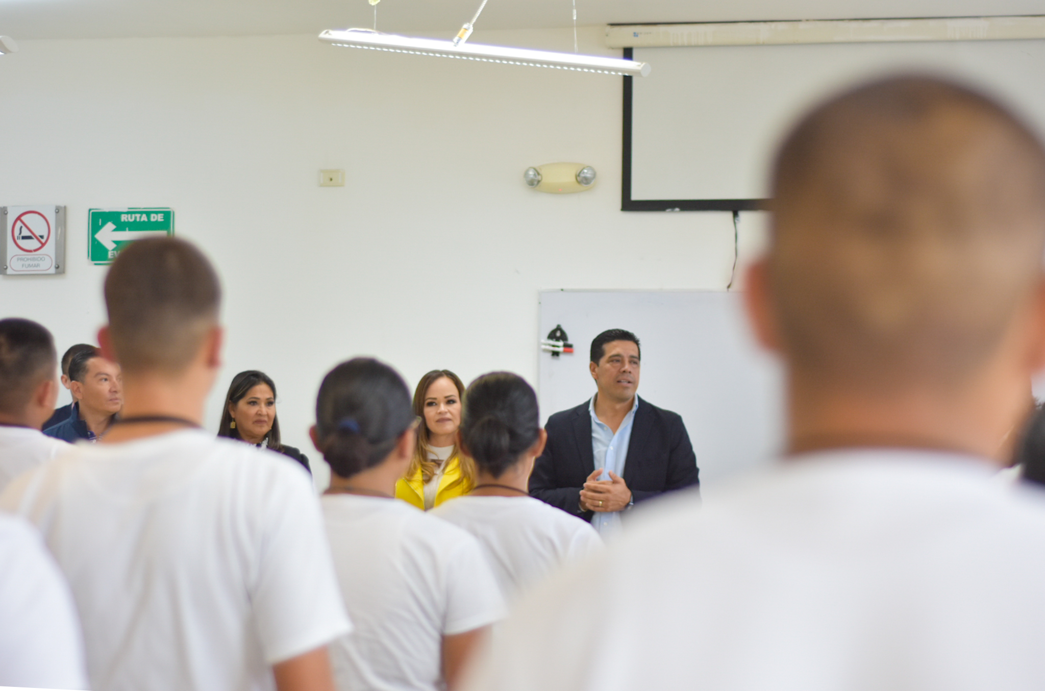 Acompañado por los síndicos Martha González Estrada y Héctor Hugo Aguilera Cordero, así como de las regidoras María Guadalupe Arellano Espinosa y Georgina Velázquez Contreras y de los secretarios de Seguridad Pública y de Obras Públicas Municipales, Antonio Martínez Romo y Miguel Ángel Huízar Botello, respectivamente; el presidente municipal saludó a los cadetes que se encontraban en clases a los cuales animó a seguir con su preparación para ser policías municipales eficientes y comprometidos con su ciudad.