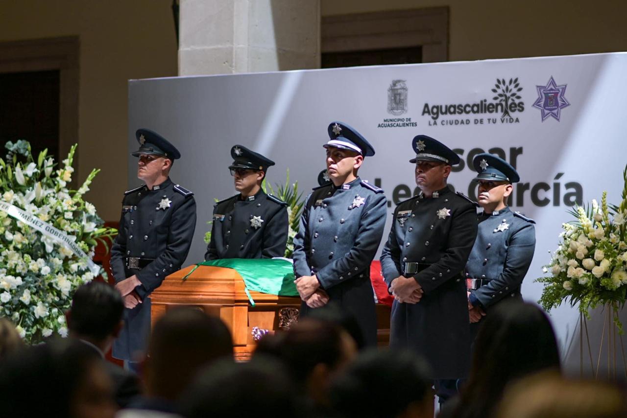 En el Segundo Patio de Palacio Municipal, el presidente municipal de Aguascalientes, Leo Montañez, encabezó el homenaje al policía preventivo Óscar León García, quien perdiera la vida el pasado viernes al caer a un socavón en la colonia Ojo de Agua.