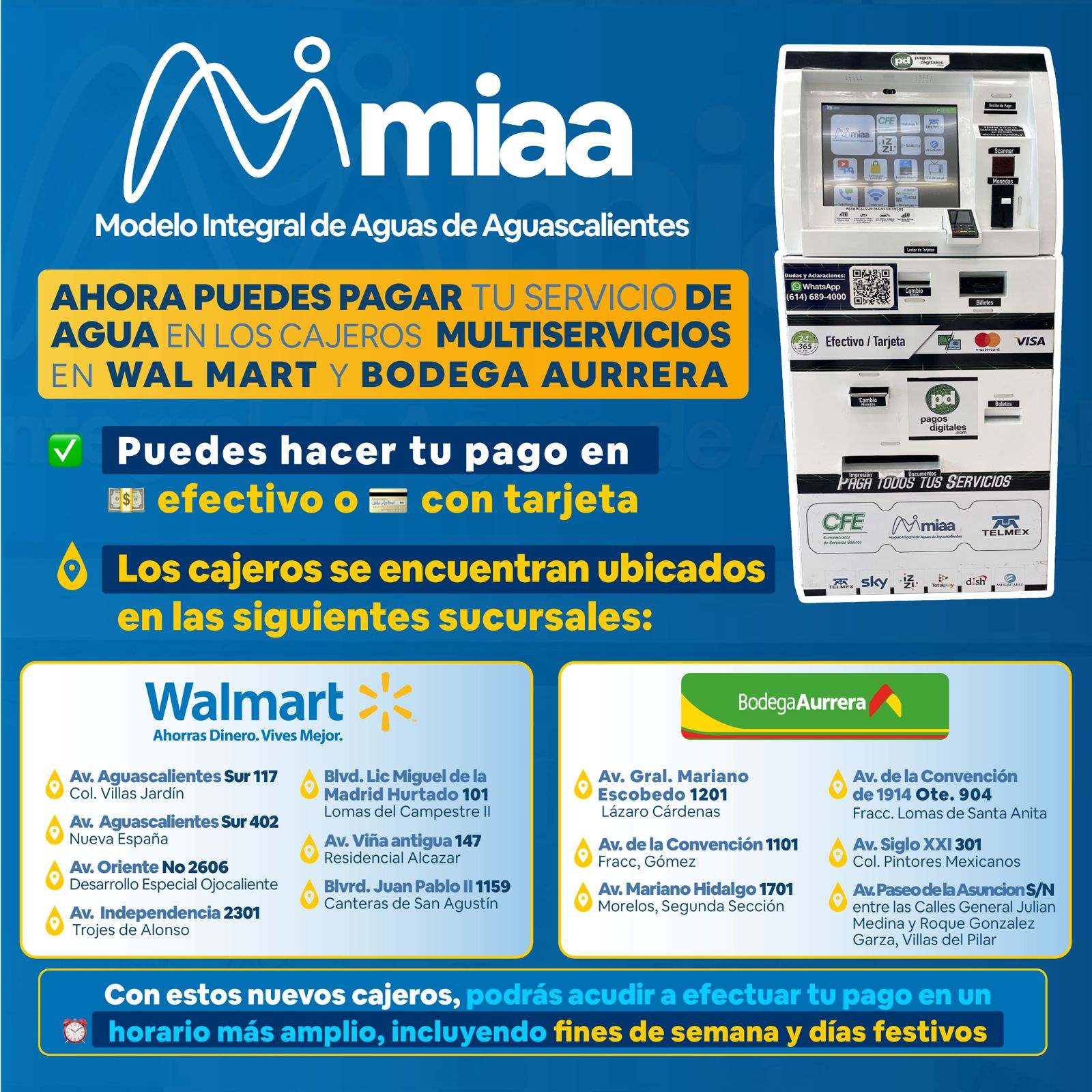 El Modelo Integral de Aguas de Aguascalientes (MIAA), anuncia que a través de la implementación de 13 cajeros multiservicios de autocobro en tiendas departamentales, las y los usuarios podrán pagar su estado de cuenta por el servicio de agua potable, de manera cómoda, segura y rápida.