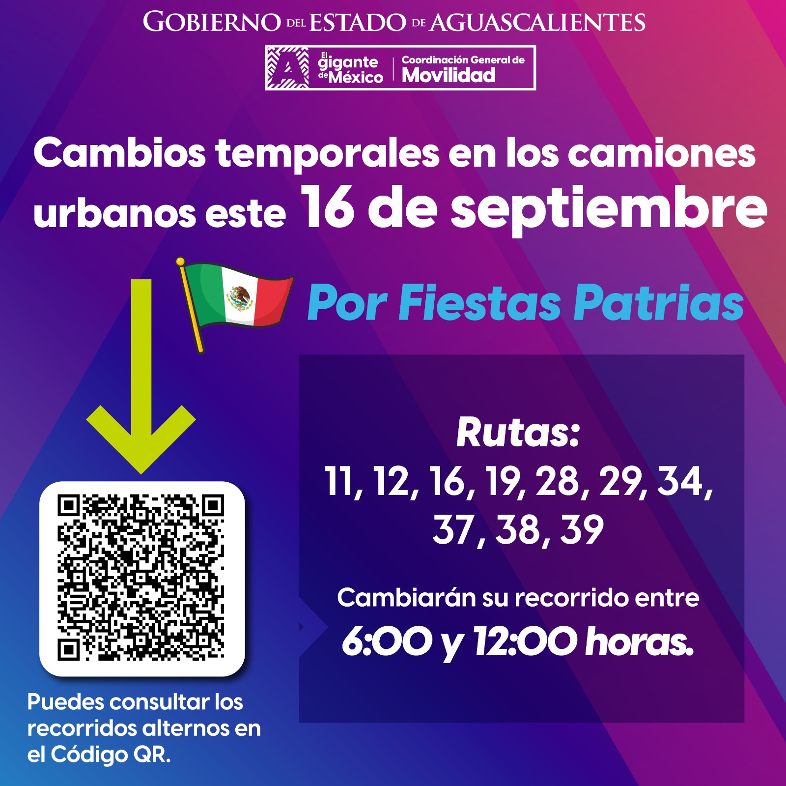 El Gobierno del Estado informa que este lunes 16 de septiembre, 23 rutas de camiones urbanos tendrán cambios temporales en su recorrido de las 6:00 a las 12:00 horas para facilitar el desarrollo del Desfile Cívico Militar en el centro de la ciudad.