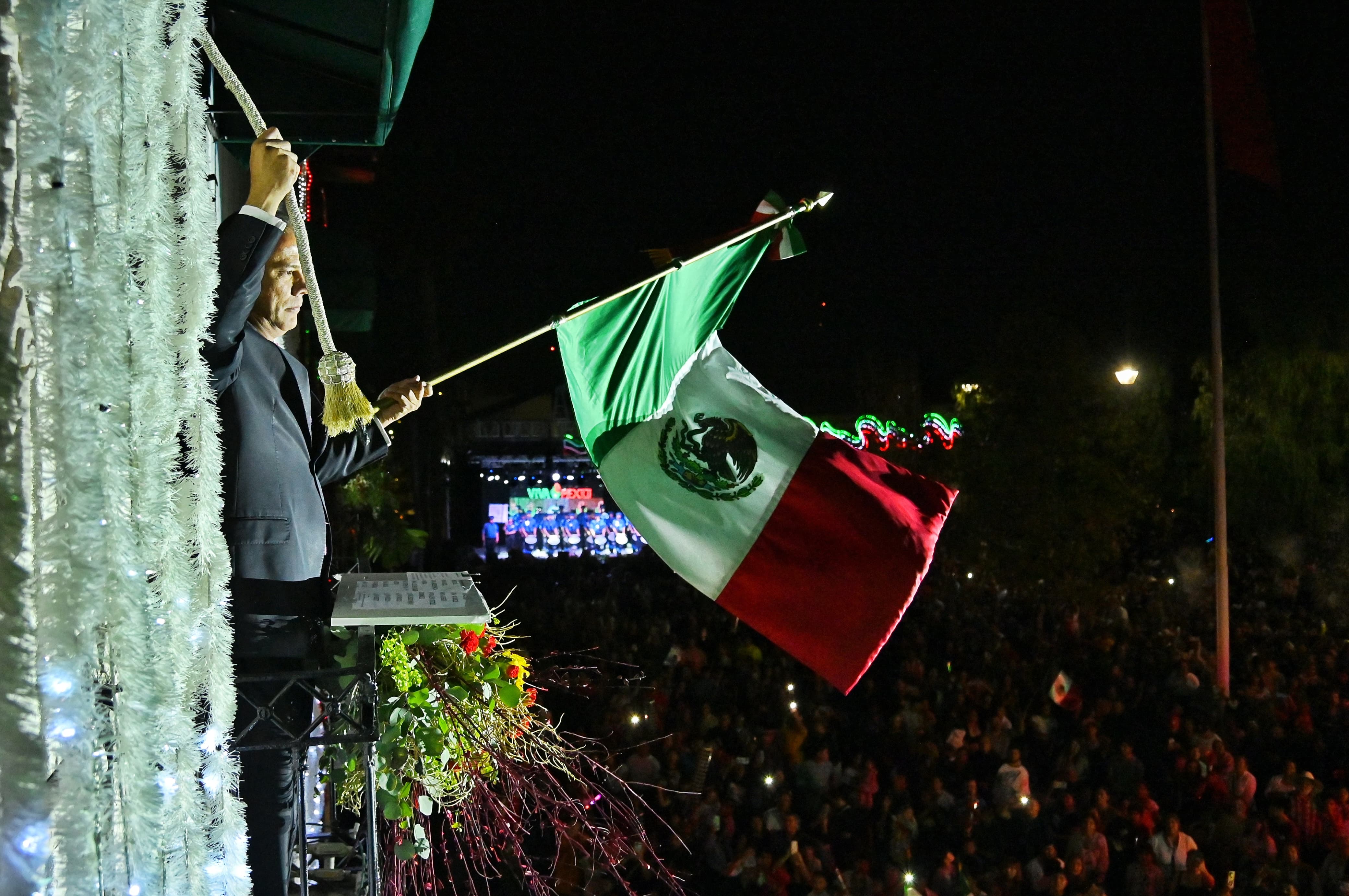Acompañado de su esposa Liliana Coronado, así como del cuerpo edilicio y funcionarios municipales, Toño Arámbula ondeó la bandera y tocó la campana desde uno de los balcones de la Presidencia Municipal de Jesús María.