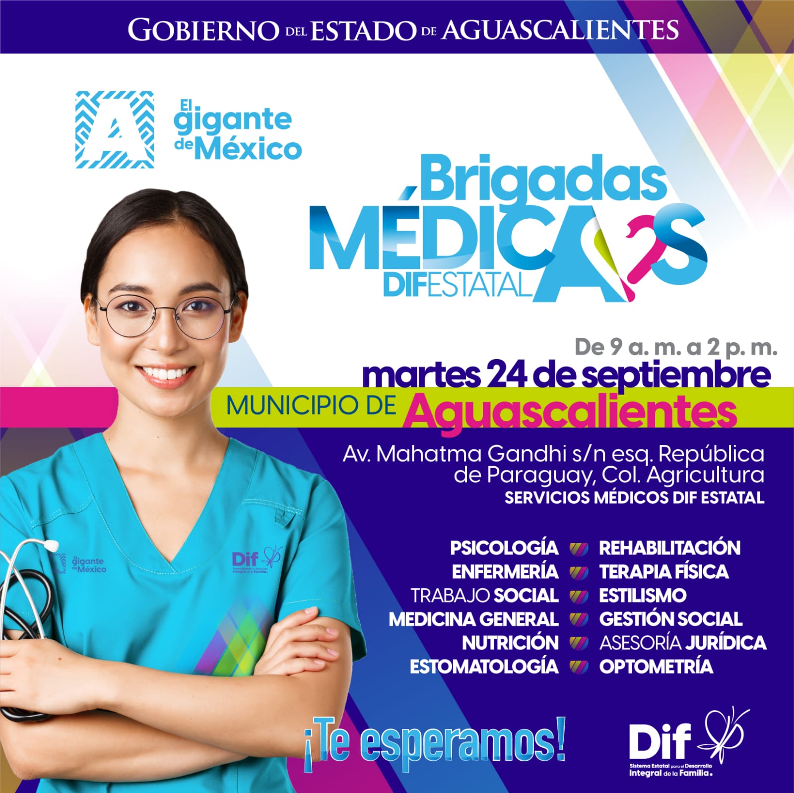 El Gobierno del Estado invita a los habitantes del municipio de Aguascalientes a asistir a la Brigada Médica gratuita que se realizará este martes 24 de septiembre en las instalaciones del área de Servicios Médicos del DIF Estatal, ubicadas en Av. Mahatma Gandhi s/n, esquina con República de Paraguay, col. Agricultura, de las 9:00 de la mañana a las 2:00 de la tarde.