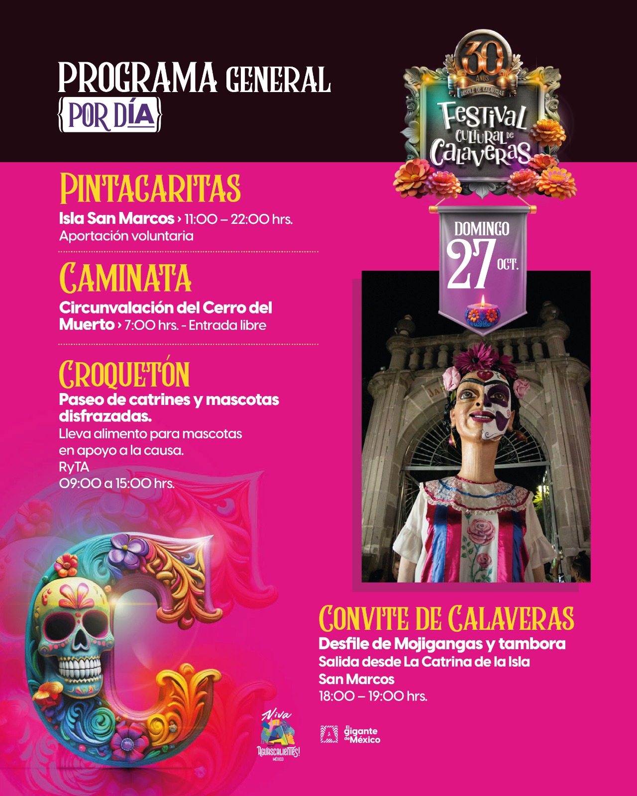El Gobierno del Estado, a través de la Secretaría de Turismo (Sectur), te invita a disfrutar este fin de semana del Festival Cultural de Calaveras 2024; habrá más de 600 actividades para toda la familia, de las cuales el 90 por ciento son totalmente gratuitas e incluyen experiencias culturales, artísticas y deportivas.