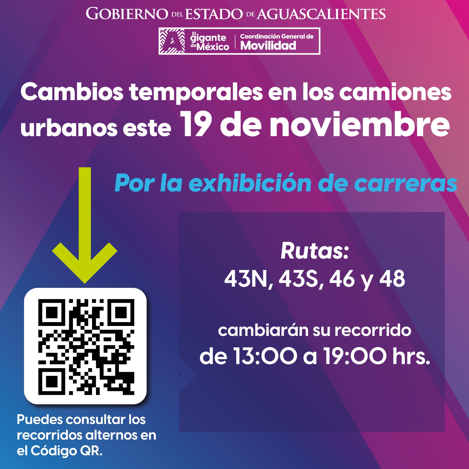 El Gobierno del Estado informa que, en la tarde de este martes 19 de noviembre, habrá cambios temporales en 22 rutas del transporte público para facilitar el desarrollo del Circuito de Exhibición de Autos de Carreras que se realizará en calles de la Zona Centro.
