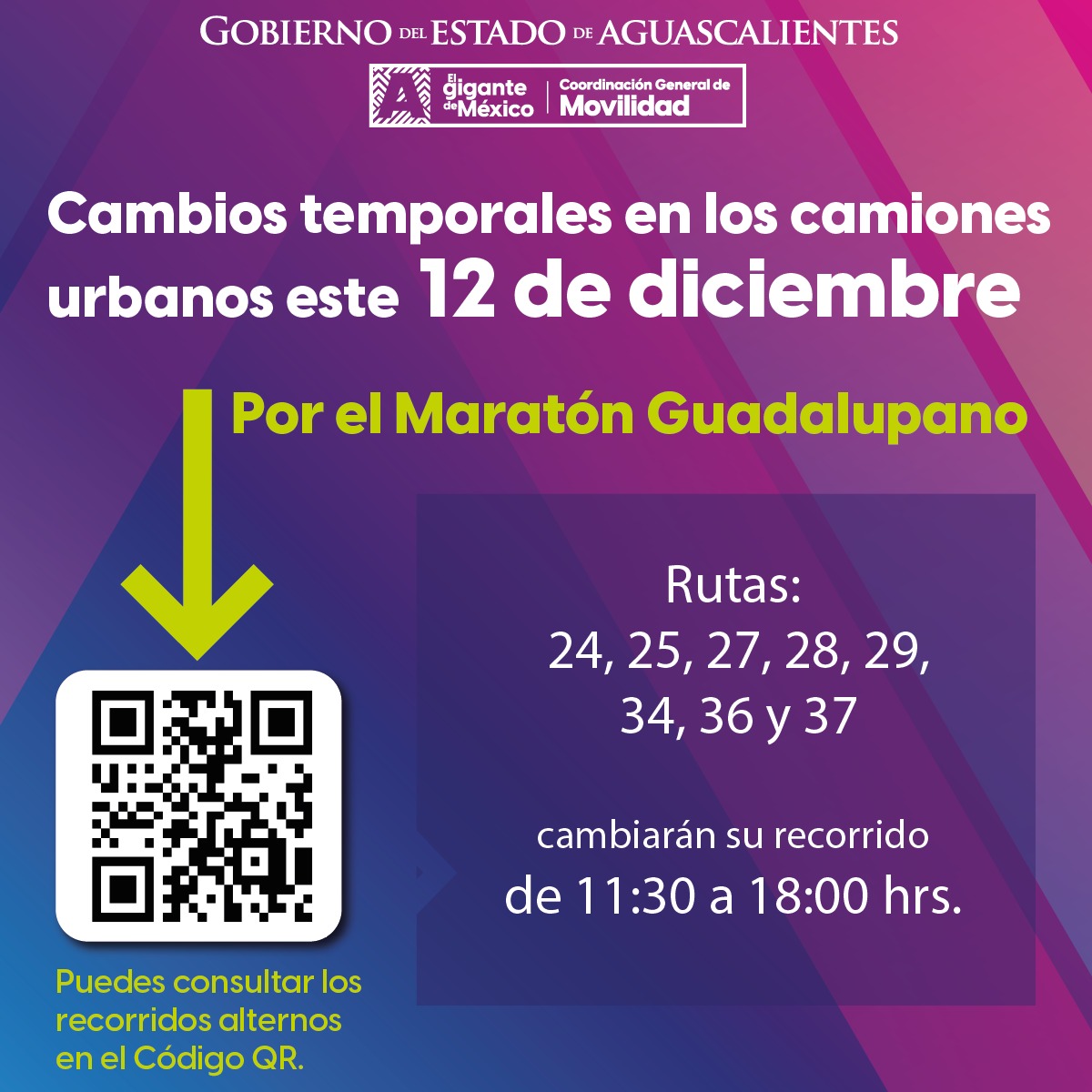 El Gobierno del Estado informa que habrá cambios temporales en 34 rutas de camiones urbanos este 12 de diciembre por el desarrollo del Maratón Guadalupano; con las modificaciones se garantiza el servicio de transporte público para los usuarios y la celebración de esta tradicional competición atlética en Aguascalientes.