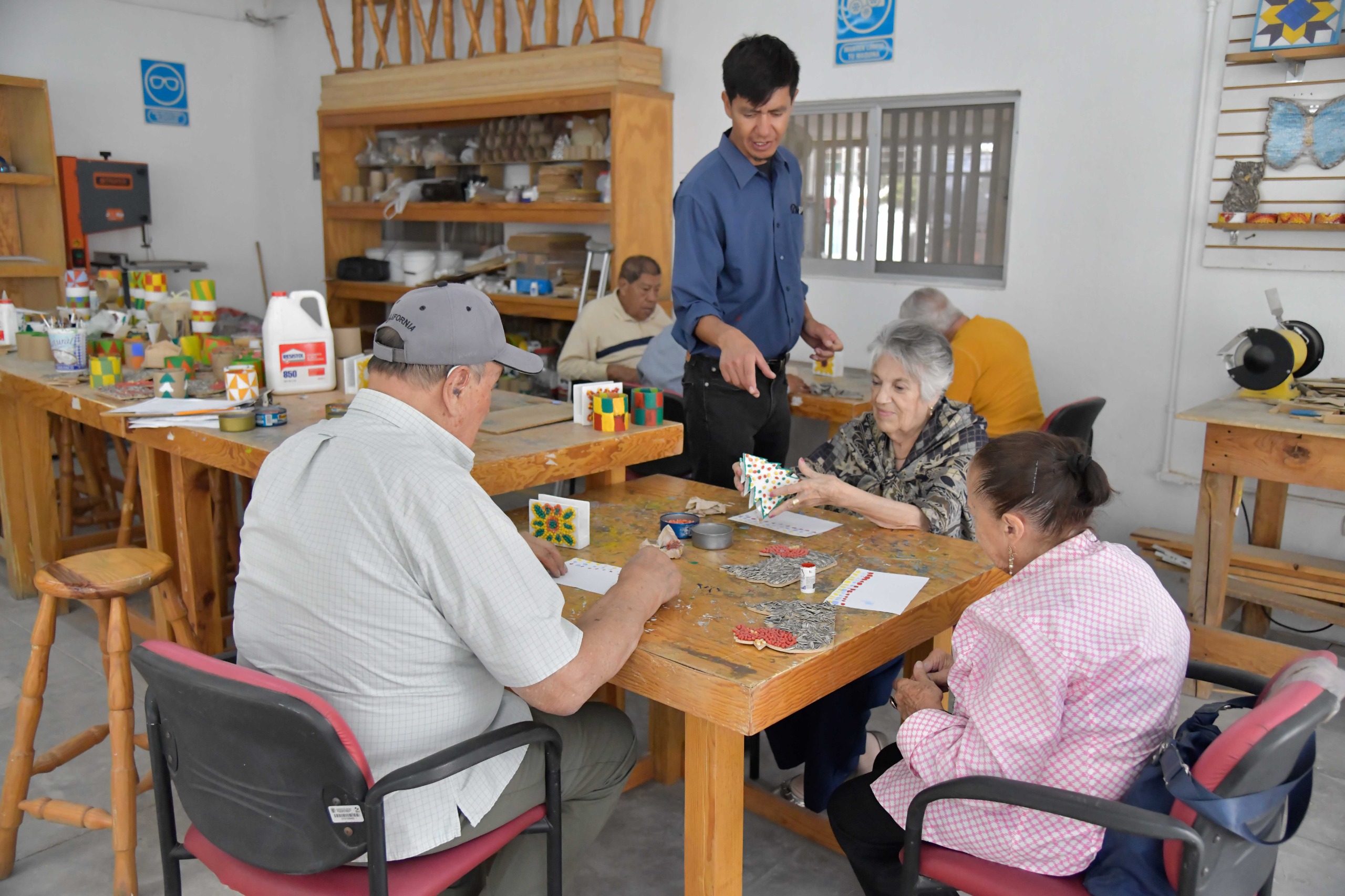 Aurora Jiménez Esquivel, presidenta del organismo, destacó que en este centro se imparten talleres de carpintería, gimnasia cerebral, activación física, canto, pintura al óleo y acuarela, pintura textil, estimulación cognitiva, bordado, costura, tejido, entre otros.