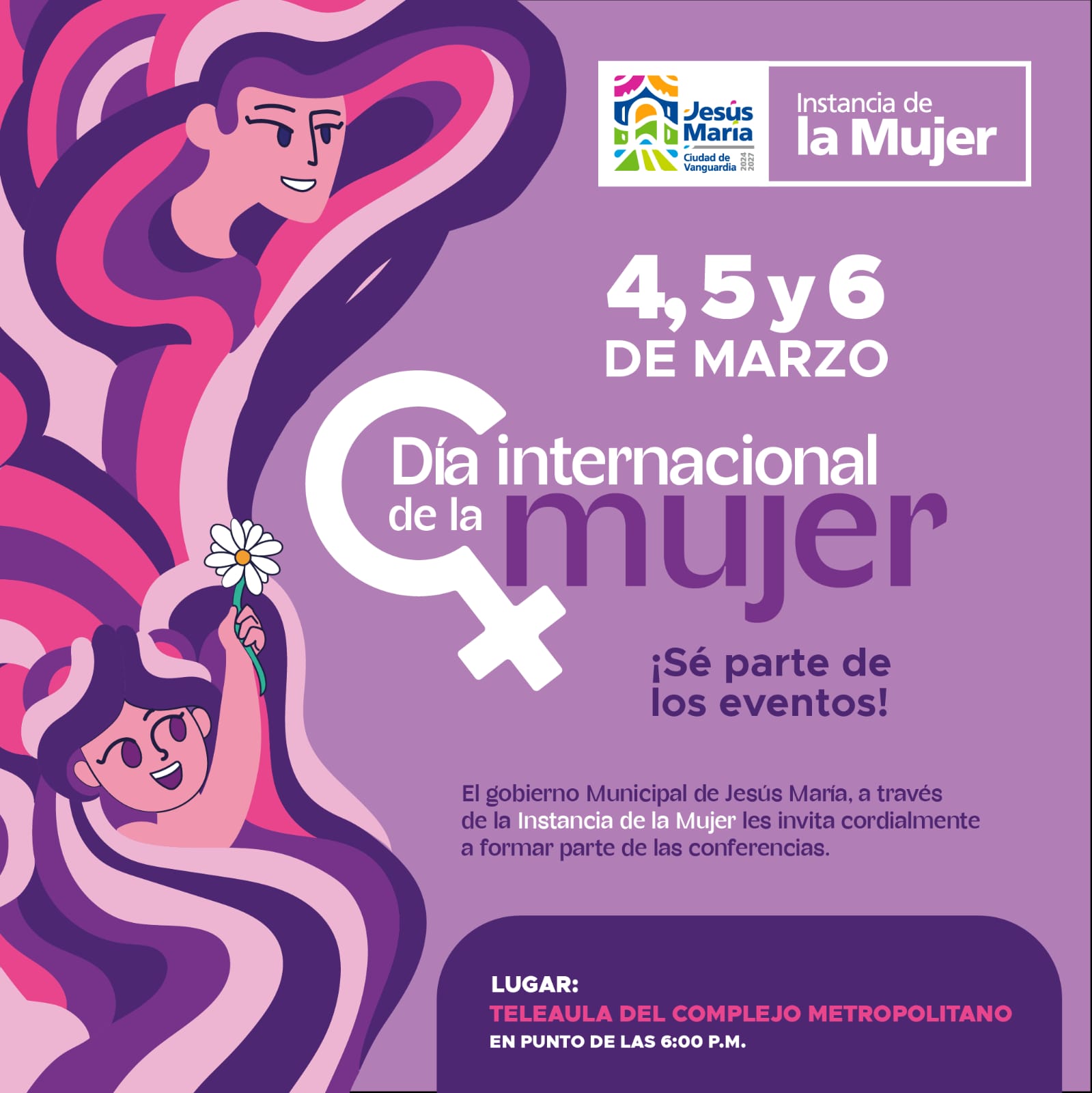 En el marco del Día Internacional de la Mujer, el Gobierno Municipal de Jesús María, a través de la Instancia de la Mujer, llevará a cabo una jornada de conferencias enfocadas en el desarrollo personal y la seguridad de las mujeres del municipio.