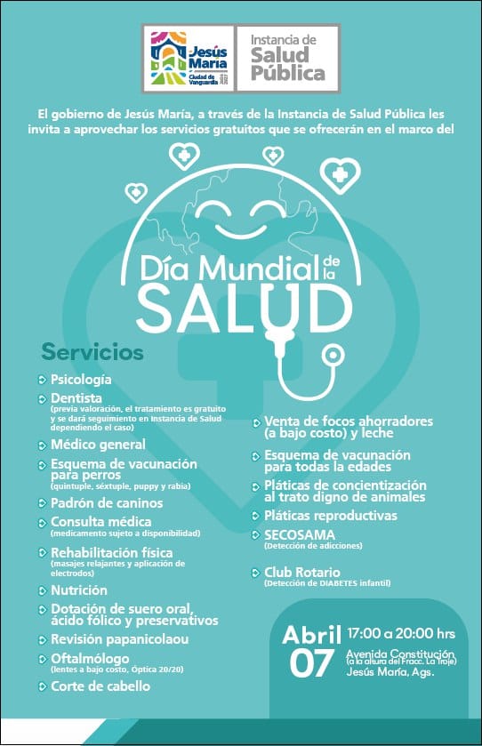 En el marco del Día Mundial de la Salud, el Gobierno Municipal de Jesús María, a través de la Instancia de la Salud, llevará a cabo una jornada especial ofreciendo servicios médicos gratuitos para toda la ciudadanía, reafirmando su compromiso con la salud de la población.
