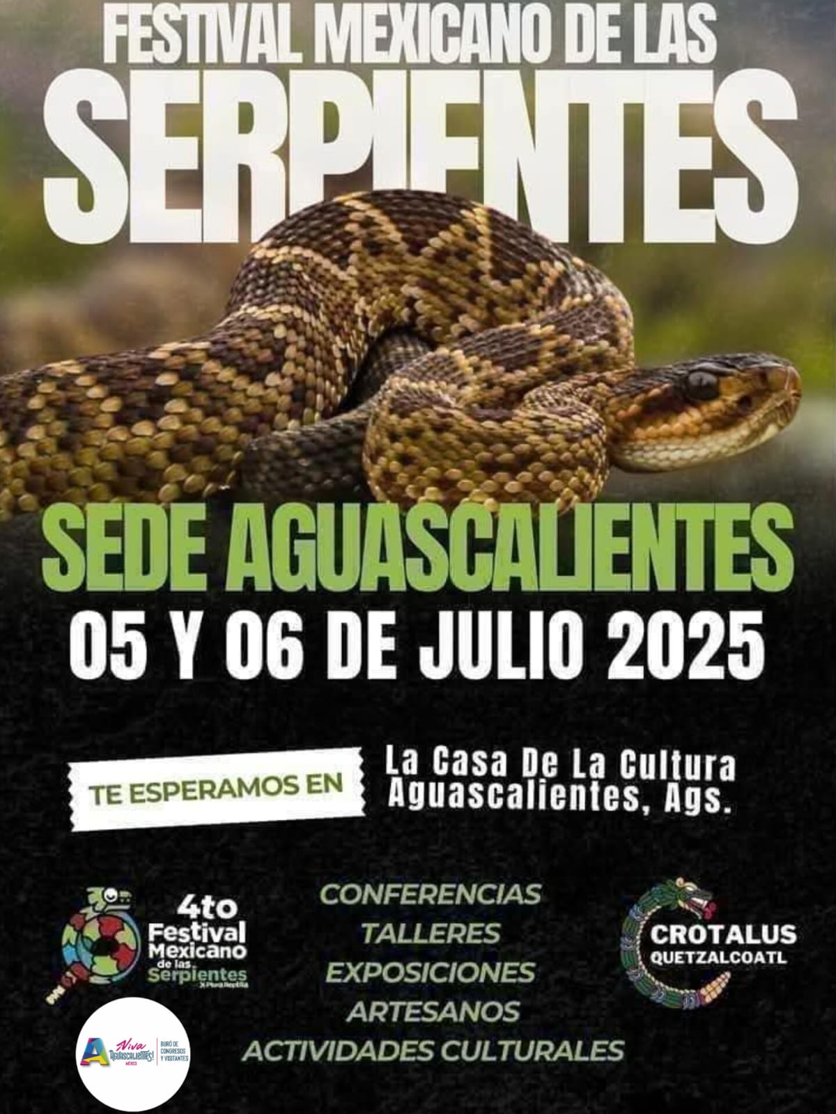 Aguascalientes será sede del 4.º Festival Mexicano de las Serpientes, que se llevará a cabo los días 5 y 6 de julio en la Casa de la Cultura de Aguascalientes. La entrada es gratuita y habrá actividades para toda la familia.