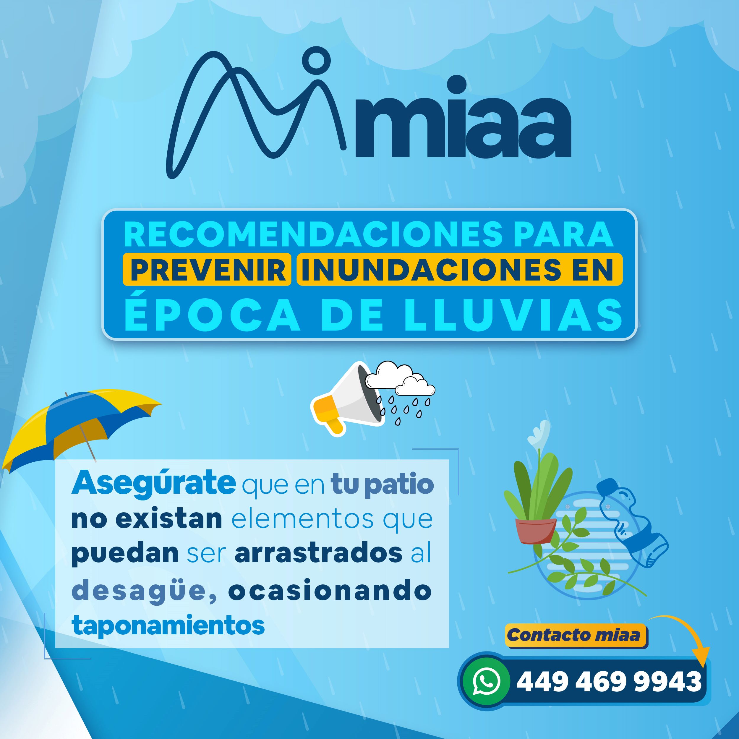 - Reportar a MIAA al WhatsApp 449 469 99 43 cualquier tipo de obstrucción en bocas de tormenta, desagües y alcantarillas, para que se