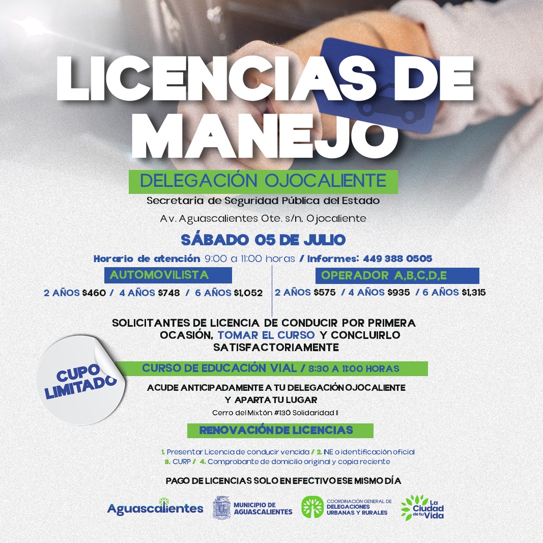 El Municipio de Aguascalientes dio a conocer que para este mes de julio continuarán las jornadas de renovación de licencias de manejo gracias al trabajo conjunto entre la Coordinación General de Delegaciones Urbanas y Rurales y la Secretaría de Seguridad Pública del Estado, por lo que para la primera semana del mes la ciudadanía podrá acudir a alguna de las dos fechas disponibles: