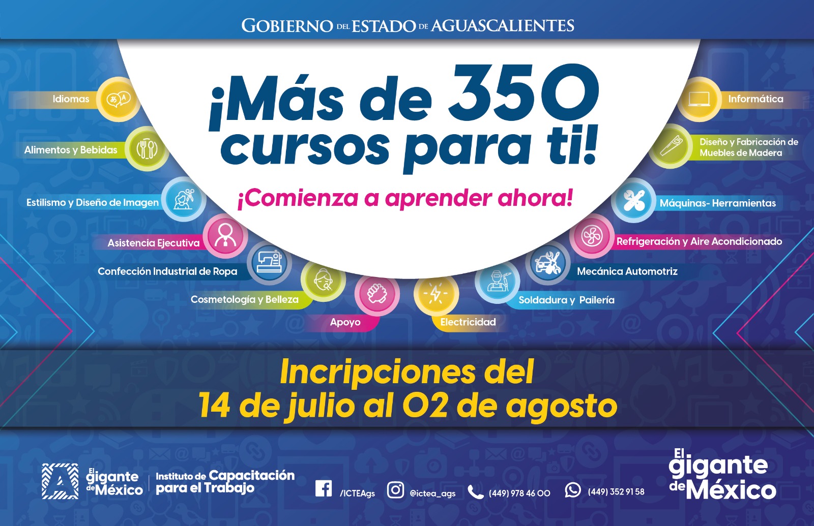 ¿Quieres mejorar tus oportunidades de empleo, aprender un nuevo idioma o prepararte en algún oficio? Esta es tu oportunidad, desde este 14 de julio y hasta el 2 de agosto, el Gobierno del Estado de Aguascalientes, a través del Instituto de Capacitación para el Trabajo del Estado de Aguascalientes (ICTEA), abre su periodo de inscripciones para más de 350 cursos prácticos y actualizados en áreas con alta demanda laboral.