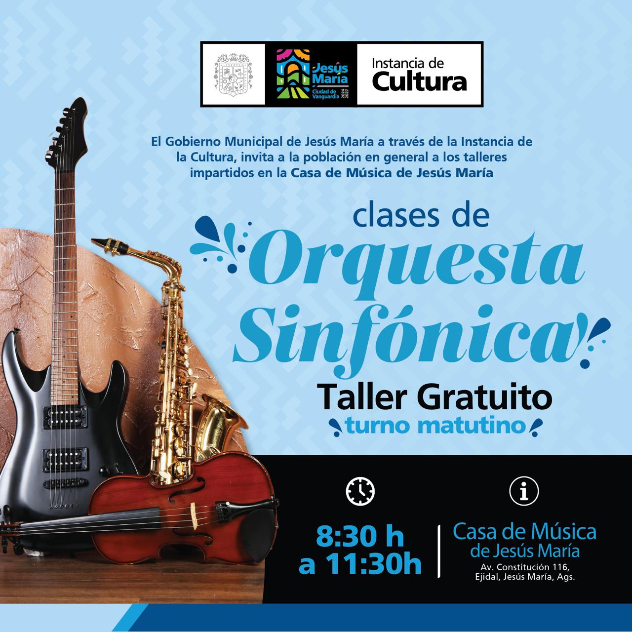 El Gobierno Municipal de Jesús María, a través de la Instancia de Cultura, informa a la ciudadanía que se encuentran abiertas las inscripciones para los talleres artísticos que se imparten en la Casa de Música ubicada en la colonia Ejidal y Margaritas.