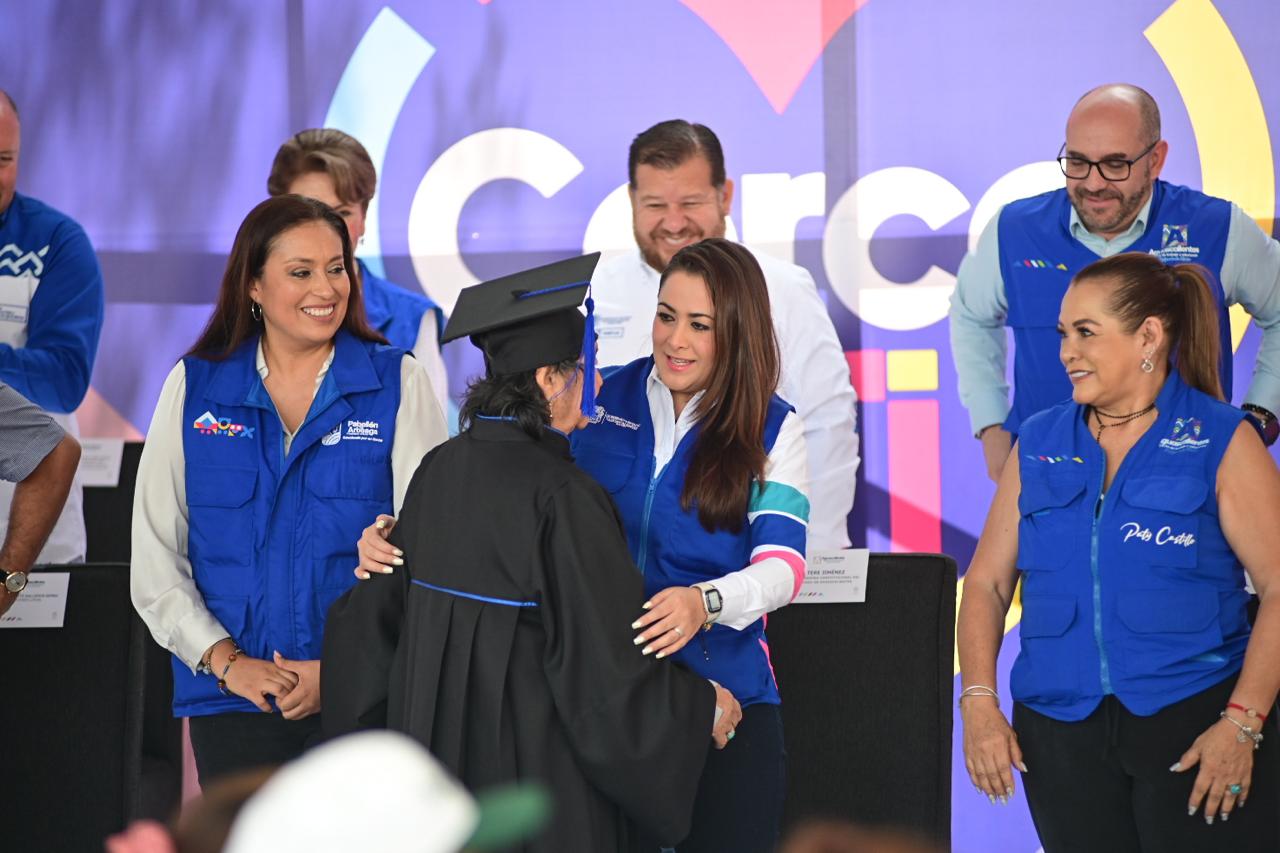 Durante el evento, Tere Jiménez y autoridades entregaron sillas de ruedas y andaderas, así como certificados de primaria y secundaria a personas mayores que concluyeron sus estudios de forma gratuita en el Instituto para la Educación de las Personas Jóvenes y Adultas de Aguascalientes (Inepja).