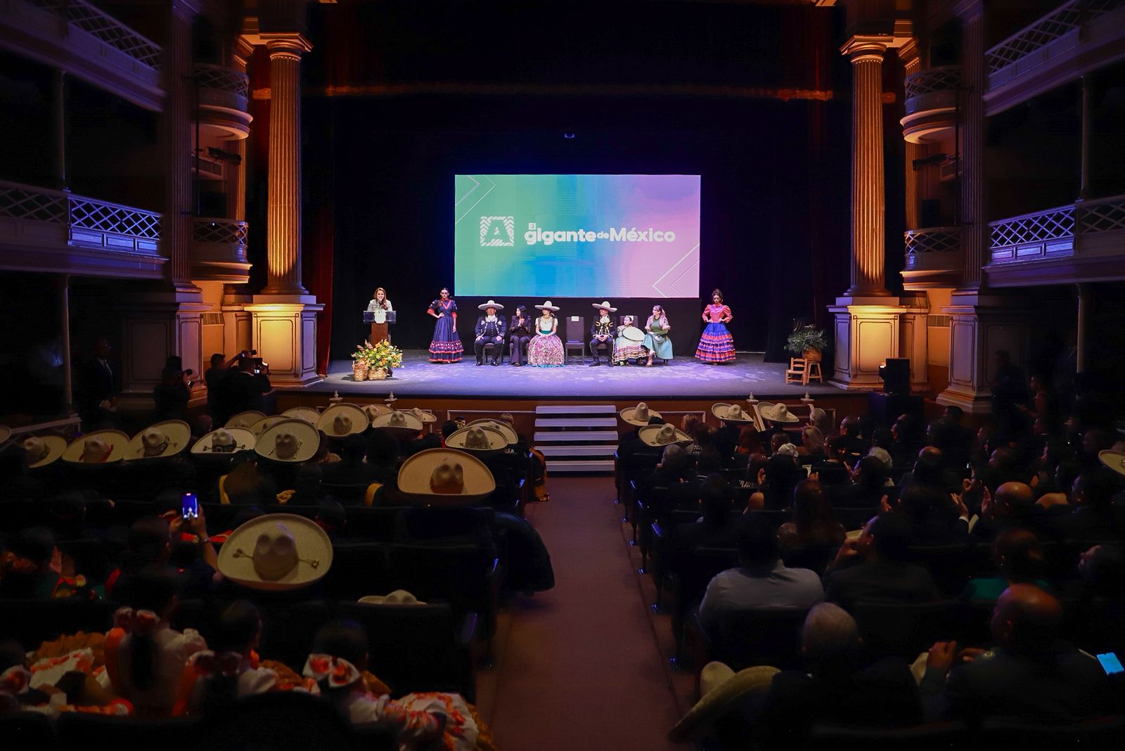 En el evento que se realizó en el Teatro Morelos también estuvieron presentes Ana Cristina Ortega y Valentina Barajas Ortega, esposa e hija de Salvador Barajas del Toro, presidente de la Federación Mexicana de Charrería A.C., y Gustavo Jiménez Castillo, presidente de la Unión de Asociaciones Charras del Estado de Aguascalientes.