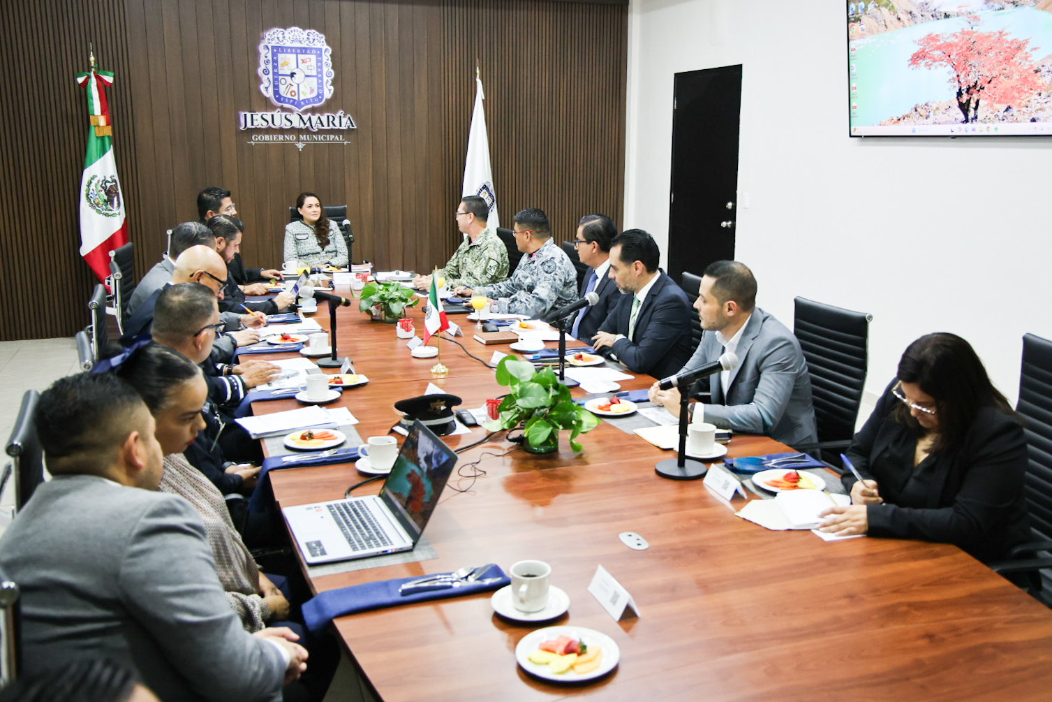 En la reunión que se realizó en la Presidencia Municipal de Jesús María, participaron César Medina Cervantes, presidente de este municipio; Daniel Romo Urrutia, alcalde de Calvillo; José Francisco Moreno Barrera, comandante de la 14/a. Zona Militar; Manuel Alonso García, fiscal general del Estado; Alejandro Ruiz Juárez, representante de la Guardia Nacional en Aguascalientes; Salvador Ortiz Esparza, jefe de Estado Mayor de la Secretaría de Seguridad Pública del Estado; Miguel Ángel Pérez Macías, secretario de Seguridad Pública y Vialidad del Municipio de Jesús María; Luis Eduardo Gaistardo Serrano, jefe de Estación del Centro Nacional de Inteligencia en Aguascalientes; Fernando Alférez Alcázar, secretario técnico de la Mesa para la Construcción de la Paz en Aguascalientes; y José de Jesús Fonseca Medina, supervisor especializado y titular de la Unidad de Investigación y Litigación "B", de la Fiscalía General de la República en Aguascalientes.