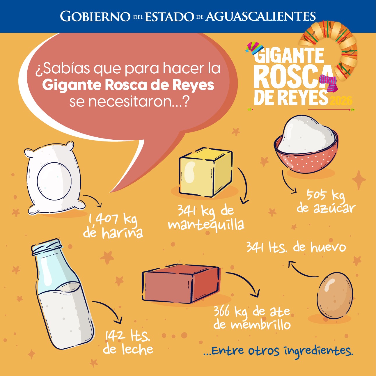 Para su preparación se utilizarán 1,407 kilogramos de harina, 505 kilogramos de azúcar, 341 kilogramos de mantequilla, 341 litros de huevo, 142 litros de leche, 17 kilogramos de sal, 7 kilogramos de levadura, 366 kilogramos de ate de membrillo y 14 mil 667 figuras del Niño Dios.