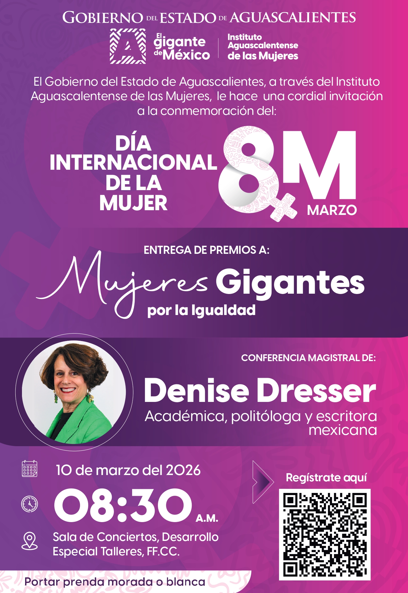 Posteriormente, a las 10:00 de la mañana se llevará a cabo una conferencia magistral a cargo de Denise Dresser, académica, politóloga y escritora mexicana, quien abordará temas relacionados con el papel de las mujeres en la vida pública y los retos actuales en materia de igualdad y derechos.