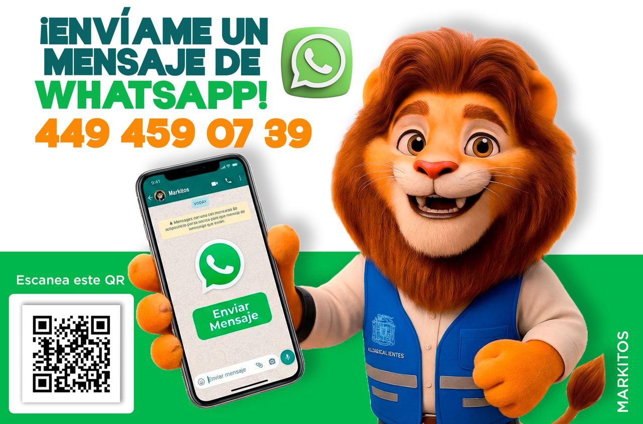 El número oficial de WhatsApp de Markitos es el 449 459 07 39, opera las 24 horas del día, y permite a la ciudadanía realizar pagos, consultas y reportes de manera sencilla a sin necesidad de trasladarse a oficinas municipales.
