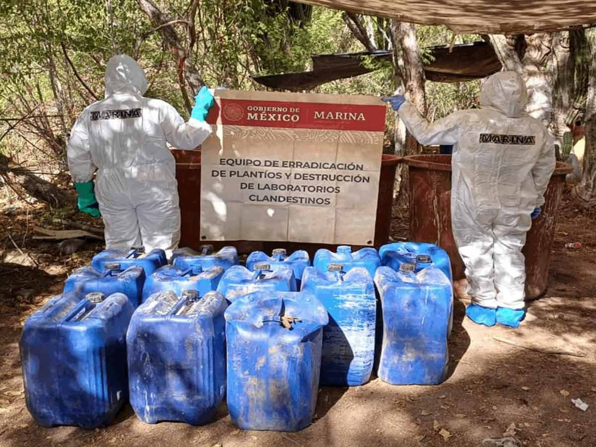 En otra acción, elementos de infantería capacitados en detección y destrucción de laboratorios clandestinos de la Armada de México, ubicaron en el municipio de Cosalá, Sinaloa, derivado de información de inteligencia en coordinación con personal de la Fiscalía General de la República (FGR) y Semar localizó dos laboratorios clandestinos, en donde aseguraron 1,050 litros de precursores químicos líquidos, 210 kilogramos de químicos esenciales, cinco destiladores y material diverso, en inmediaciones de los poblados de San Francisco Tacuichamona y Palo Dulce.
