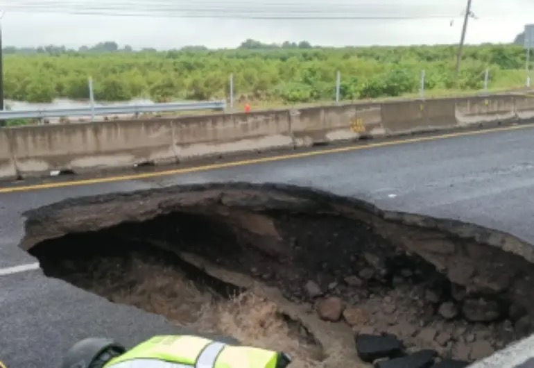 El socavón abarca dos carriles de la carretera, pero elementos de la Guardia Nacional cerraron ambos sentidos para evitar algún accidente.