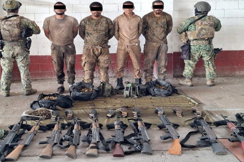 En una acción simultánea derivada de los recorridos de vigilancia, el personal militar ubicó a dos personas más, entre ellas un menor de edad. Los detenidos portaban seis armas largas, 40 cargadores, 640 cartuchos y tres chalecos tácticos.