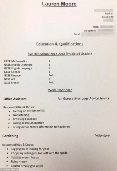 El padre de la chica de 16 años, habitante del Reino Unido, fue el encargado de redactar el currículum, que se ha vuelto viral en redes sociales.