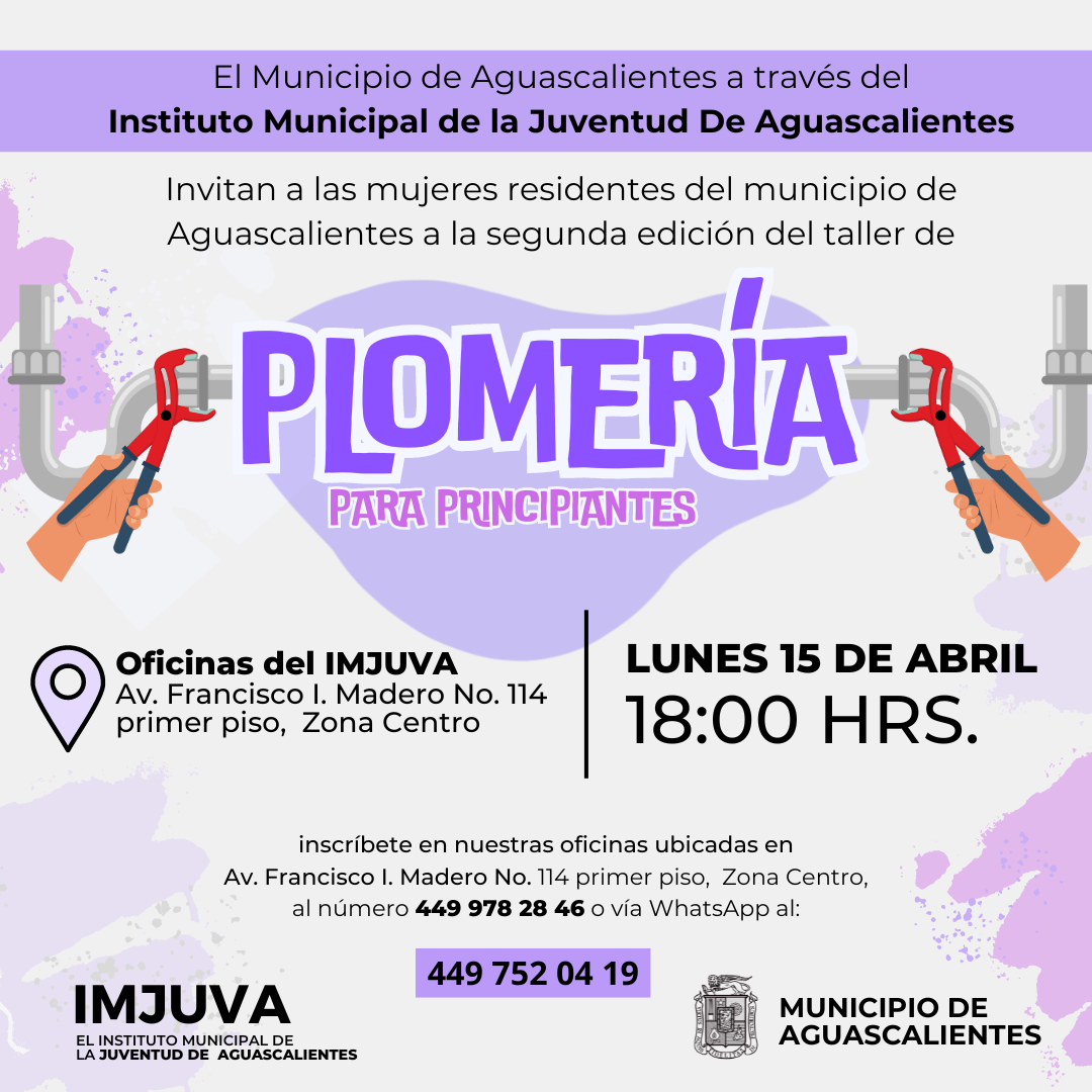 El Instituto Municipal de la Juventud de Aguascalientes (IMJUVA), invita a participar en el taller Plomería para Principiantes dirigido a mujeres, a través del cual se fomenta la participación activa de las mujeres en actividades comúnmente realizadas por hombres.