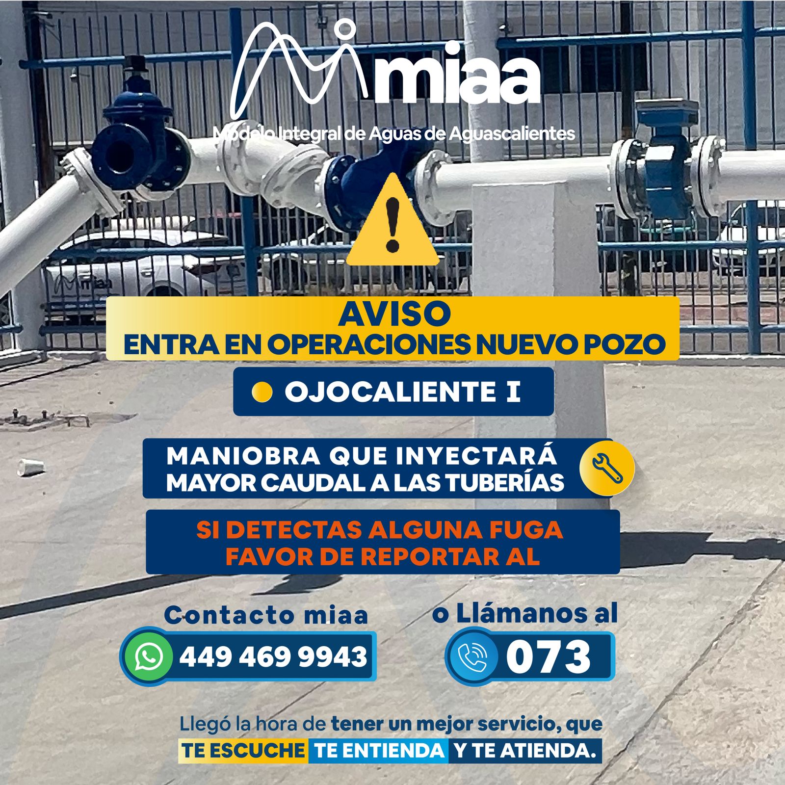 El Modelo Integral de Aguas de Aguascalientes (MIAA), informa a la ciudadanía que después de los trabajos de construcción, equipamiento e introducción de líneas de conducción y distribución, el día de hoy arranca la operación del pozo 91-A, ubicado en Av. Alameda.