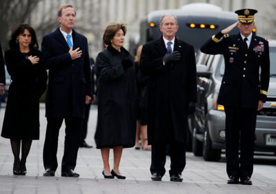 El expresidente George W. Bush (2001-2009), hijo mayor del mandatario fallecido, presenció junto a su esposa Laura Bush el traslado del ataúd, con la mano en el pecho.