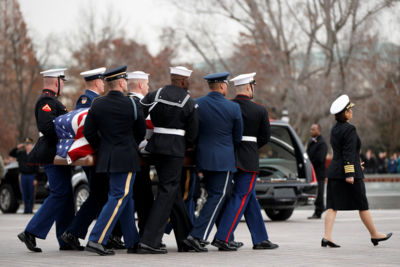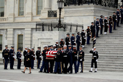 Una decena de militares transportaron el ataúd, cubierto con la bandera estadunidense, desde la escalinata del Congreso en Washington hasta el vehículo fúnebre que debía transportarlo hasta la Catedral, media hora antes del inicio del servicio religioso.